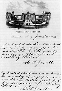 THE HISTORY of Mount Holyoke College and its graduates in the nineteenth century encompasses references to institutions for the education of women founded by Holyoke graduates, following in the footsteps of Mary Lyon.1. This experience of aiding in founding, or of establishing, educational institutions occurred not only in New England but further west as settlement spread. Dartmouth College has its share of graduates who have been involved, some more than others, in the spread of education. In the case of several alumni, the interest was especially in the education of women. Milo Parker Jewett 1818, born in St. Johnsbury, Vermont, became first an educator, but at the same time he read law and subsequently graduated from Andover Theological Seminary in 1833. Jewett got around; he established the successful Judson Female Institute in Marion, Alabama. Later, in 1856, he returned northward and purchased the Cottage Hill Seminary, a school for girls in Poughkeepsie, New York. It was here thatJewett became acquainted with Matthew Vassar. Vassar had intended originally to use his wealth to establish a hospital but was persuaded by Jewett to turn it to creating Vassar Female College. Subsequently, due to circumstances about which interested researchers can read, Jewett, who had become the first president of Vassar, resigned.2.