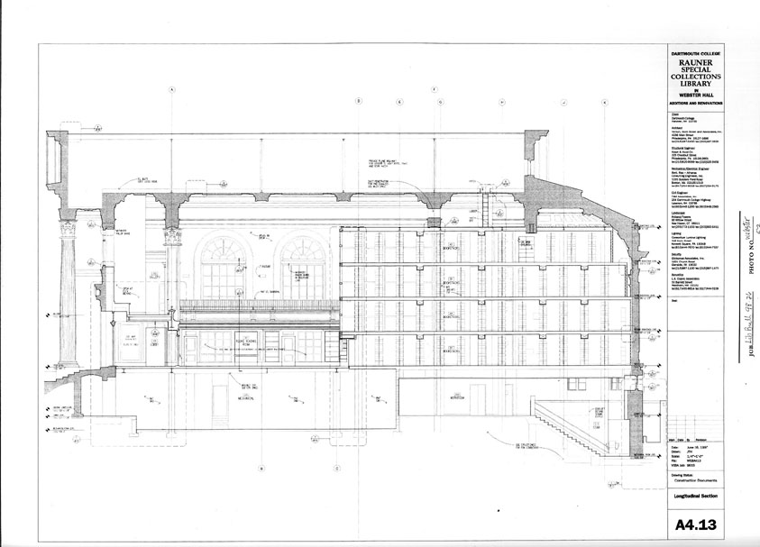 On the following pages are longitudinal sections of the construction drawings for the renovation of Webster Hall into the Rauner Special Collections Library, scheduled to be completed in the fall of 1998, and the current design of Berry Library, scheduled to be completed in the summer of 2000. The latter illustration provides a view of Berry Library as it adjoins Baker Library.
