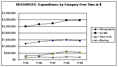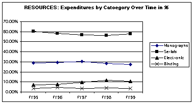 The Library collection supports research and instruction in undergraduate, graduate and professional programs in the Arts and Sciences and the three professionals schools. In raw numbers, print materials represent the vast majority of the Librarys resources. Described in terms of expenditures in FY99, the Library spent approximately 27% of its budget on print monographs, 57% on print serials, 11% on digital resources, 4% on binding, and 1% on other resources (including audio-visuals).