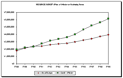 The Library depends upon the information resources budget to provide the funding to purchase those resources needed on site, to preserve those materials which are part of the permanent collection, and to make available those tools which facilitate access to information resources located elsewhere. Two major factors affecting resources are the rising cost of these resources which is increasing annually at a rate more than double the annual inflation rate, and increased need to invest in access to a growing body of digital resources. During the past decade, rising prices for information have seriously eroded this budget. A rapidly growing need to provide access to information in digital formats is placing additional pressure on a severely strained resource. Since 1987 the cost of Library materials has risen nearly 275%, while during the same period the resources budget increased approximately 140%. The chart below provides a graphic representation of the increasing discrepancy between the library budget (actual budget) and the dollars needed in order to merely keep pace with inflation (level + inflation). During the previous decade substantial progress was made toward maintaining the purchasing power of the resources budget. That goal was achieved in 1990. Since that time the discrepancy between the annual inflation rate for information resources and the yearly budget increments has increased markedly to the point that in FY99 the budget had lost over 35% in purchasing power. In terms of dollars available, over the ten-year period since 1987, the resources budget has lost in the aggregate over $4 million. In FY99 alone, the 35% reduction in purchasing power represented approximately $2 million.