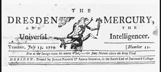 The use of Dresden as a name was not limited to the College District. To promote the cause of the Western Rebellion, Eleazar Wheelock initiated a search for a printer and printing press. The effort was successful, and in October 1778, Alden Spooner, a printer from Massachusetts, began printing 'in the South End of Dartmouth College.' The Dresden imprints included broadsides, sermons, political pamphlets, and laws of Vermont, as well as the first printing of the College's charter and its first general catalogue (the latter containing the names of graduates from 1771 to 1779). Spooner also published a newspaper, The Dresden Mercury, and the Universal Intelligencer. How long it appeared is not known-only five copies are extant, the latest dated 27 September 1779. [24]